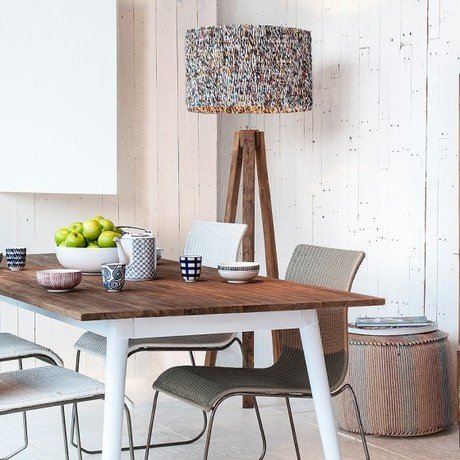 Элегантный торшер из массива тика, стандартный абажур выполнен из плетеной бумаги пропитанной специальным составом.