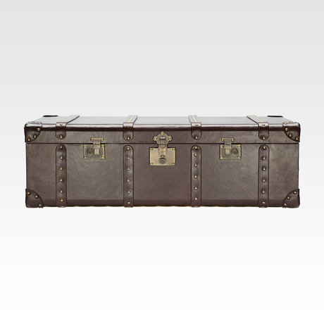 Оригинальный низкий журнальный столик из натуральной кожи, выполненный в виде сундука, теплого каштанового цвета. Отлично впишется в пространство гостиной комнаты.