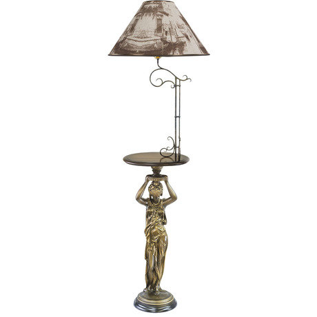 Напольный светильник поражает своим строением. Скульптура прекрасной гречанки из мрамора является основой для круглой деревянной подставки. Кованная сталь держит на себе светильник с тканевым абажуром.