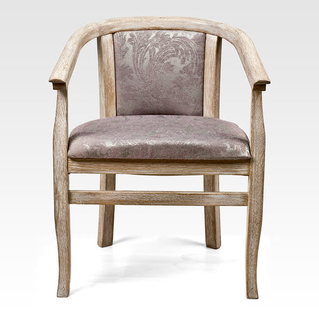 Стул с закругленной спинкой и ручками обит тканью с растительным узором в сочетании серебристого и бледно-фиолетового цветов. Модель изготовлена из дубового массива с эффектом состаренности.