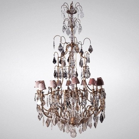 Подвесной потолочный светильник в классическом стила на 12 свечей. Выполнен из металла, декорированного под винтажную ковку, с использованием стеклянных подвесок и текстельных абажюров. Идеально украсит большую гостинную или банкетный зал.