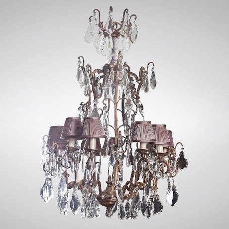 Подвесная люстра, выполненная из металла, декорированного под винтажную латунь. Расчитана на 10 свечей (ламп), декорированных текстильными абажурами. Украшена стеклянными подвесками и элементами.