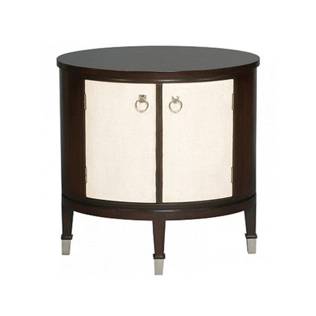 Стильный приставной столик округлой формы с открывающимися дверцами, внутри которых вы можете с комфортом разместить подручные и другие предметы. Модель выполнена из дерева в нескольких цветовых отделках с декоративной металлической фурнитурой.