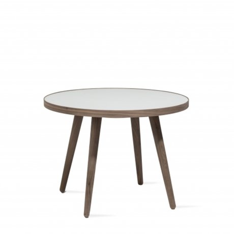 Этот кофейный столик на высоких расставленных ножках как бы отсылает нас в 70-е годы, стиль которых сейчас весьма актуален. Выполненный из массива ореха, природный рисунок которого здесь сохранён, этот столик выглядит нарядно ещё и благодаря цвету топа столешницы – он жемчужно-серый, почти белый.