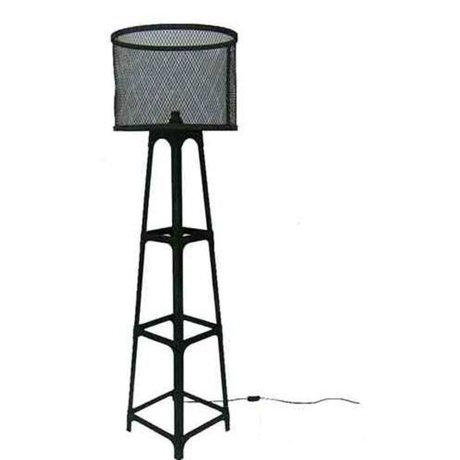 Оригинальный торшер в черной отделке на высоких ножках, имеет металлический сетчатый абажур.