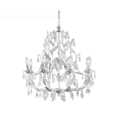 Основание этой высокой люстры сделано из серебристого металла в виде изящных веток с листочками. Граненые подвесы из прозрачного стекла смотрятся цветами и фруктами. Светильник рассчитан на 8 ламп с цоколем Е14.