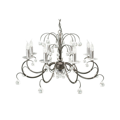 8-рожковая люстра выполнена из серебристого металла. Декорирована розетками и подвесами из граненого стекла. Светильник рассчитан на 8 лапи с цоколем У14 мощностью до 60 Вт каждая.