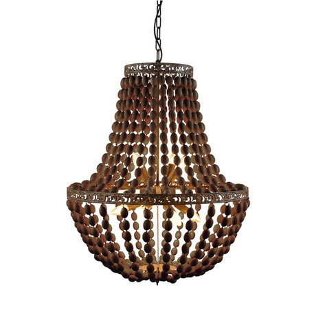 На металлических рамах с ажурным растительным рисунком закреплены крупные деревянные бусы, образующие классическую форму люстры. Светильник рассчитан на 12 лам с цоколем Е14 мощностью до 40 Вт.