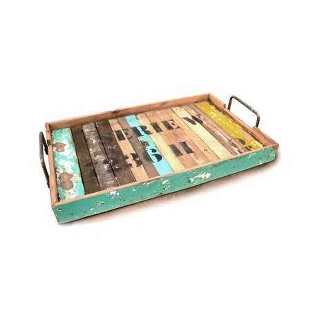 Оригинальный поднос, который внесет разнообразие в интерьер. За счет яркой расцветки фактурные состаренные досочки с клеймом выглядят не грубо и брутально, а очень мило, будто этот предмет сделан из подручных материалов, чтобы поскорее порадовать завтраком в постель.
