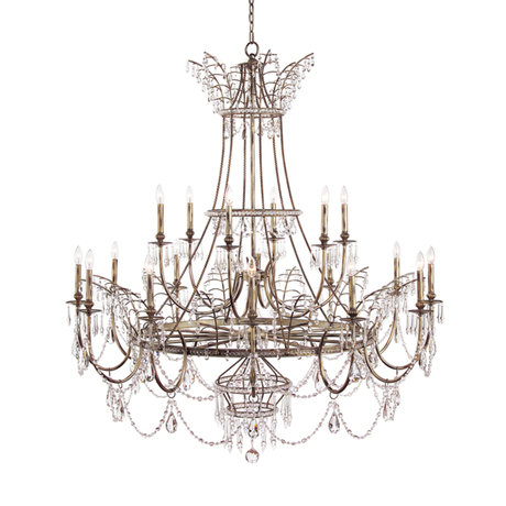 Очень большая и при этом невероятно легкая люстра. Цоколи лампочек выполнены в виде свечей. На металлический каркас, в основе которого лежит форма колеса, нанизаны тонкие хрустальные гирлянды, дополненные более крупными гранеными хрусталиками в форме ядер миндального ореха.