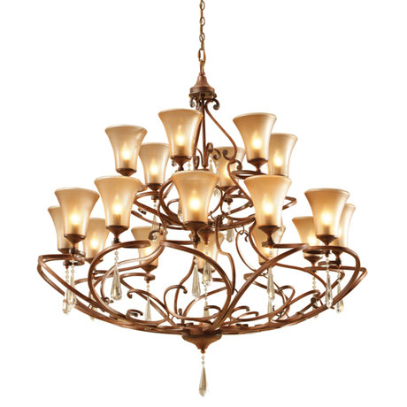 Объемная люстра Filante от итальянских дизайнеров - более метра в диаметре - подойдет для оформления света в просторных помещениях с высокими потолками. 18 ламп расположены на двух ярусах, люстра декорирована подвесками и спиралевидными креплениями для плафонов. Отличный вариант для загородного дома.