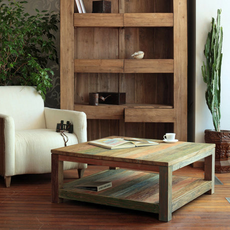 Невысокий квадратный журнальный стол. Столешница и нижняя полка составлены из досочек. Детали стола выкрашены в приглушенные цвета и затем «отмыты».
