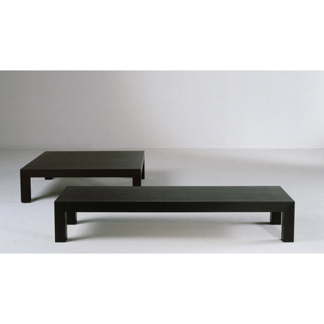 Низкий и длинный журнальный столик из черного лакированного дерева. Благодаря нестандартным пропорциям он притягивает взгляд, не смотря на достаточно простую форму. Монолитность конструкции придает то, что грани ножек и торец столешницы одинаковы по ширине.