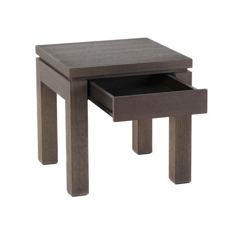 Компактный журнальный столик, под столешницей которого спрятался выдвижной ящик. Темное дерево покрыто лаком.