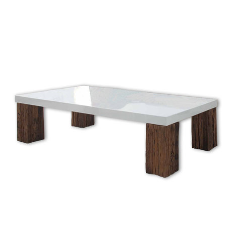 Этот столик полон контрастов. Они заложены даже в его пропорциях -- он сделан низким, но длинным. Глянцевая мраморная столешница белого цвета лежит на четырех массивных ножках-столбах из брашированного темного дерева.