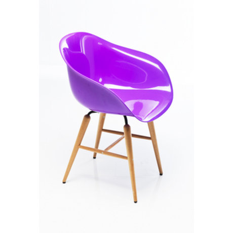 Ярко-фиолетовое сиденье представляет единую конструкцию со спинкой и подлокотниками. Оно очень удобное благодаря анатомической форме. С неожиданно ярким, глянцевым сиденьем контрастируют высокие ножки из натурального дерева.