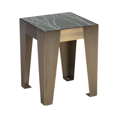 Оригинальный по дизайну журнальный столик выполнен из металла «под бронзу». Столешница, отделанная тёмным закалённым стеклом, декорированным абстрактным рисунком, смотрится на фоне металла весьма необычно. Общее впечатление – предмет стильный и современный, достойный того, чтобы украсить собой нестандартный интерьер.