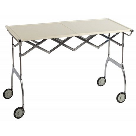 Универсальный и функциональный предмет от итальянского бренда Kartell - передвижной столик-тележка с металлическим основанием и пластиковой столешницей кремового оттенка. Стол обладает несложным механизмом трансформации.
