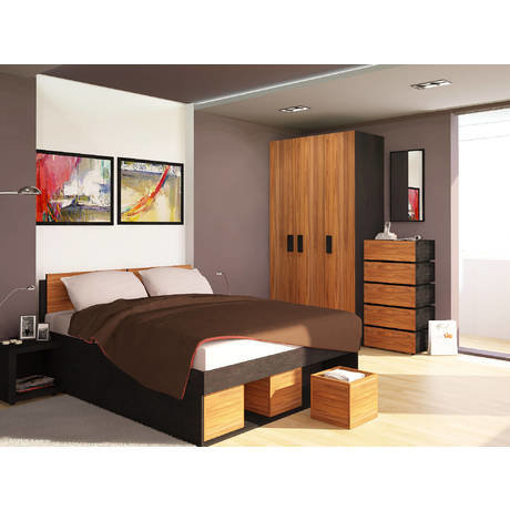 Три куба цвета «палисандр» могут показаться обычным украшением спальни, но на самом деле – это небольшие ящики для хранения мелких вещей. Цвет «палисандр» отлично сочетается с цветом «венге», в котором выдержаны каркасы предметов мебели из этого комплекта.