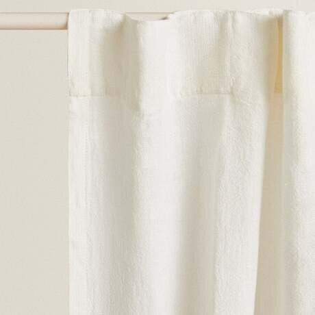 Белая льняная занавеска из неравномерного переплетения с тщательно складчатой отделкой и высокой непрозрачностью. Имеет заголовок занавески и вкладки вверху. Лен придает шторам исключительную легкость, позволяя свету мягко просачиваться сквозь него и создавать игру теней и света, что придает декору глубину. Эта особенность не только создает светлую атмосферу, но и усиливает ощущение свежести и естественности в помещении. Продается индивидуально.