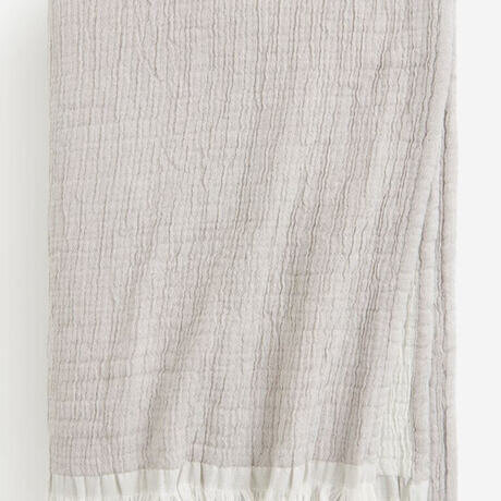 Покрывало для двуспальной кровати из воздушной, мягкой хлопчатобумажной ткани с бахромой по коротким сторонам.
