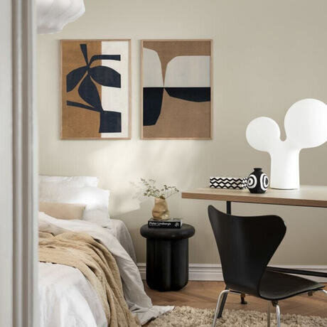 Абстрактная интерпретация цветка с яркими черными формами, выделяющимися на естественном бежевом фоне.
