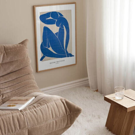 Репродукция вырезанной из бумаги Анри Матисса, изображающей женский силуэт синего цвета. Нарисована гуашью, вырезана и наклеена на бумагу на холст. Плакат обрамлен интегрированной белой рамкой. Анри Матисс, провидец в мире искусства, оставил неизгладимое впечатление своими смелыми цветами и упрощенными формами. Будучи лидером движения фовизма, его яркие картины стремились создать эмоциональную связь со зрителями, используя цвет для выражения радости, чувственности и жизненной силы. Новаторский подход Матисса к искусству продолжает вдохновлять художников и зрителей и сегодня, укрепляя его наследие как одного из самых влиятельных художников 20-го века.