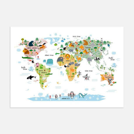 Позвольте вашему ребенку исследовать все уголки мира с помощью нашей красочной и подробной карты мира, которая идеально дополнит детскую комнату. На рисунке изображены дикие млекопитающие, рептилии, птицы и рыбы, обитающие на разных континентах. Гарантированный интересный способ обучения для детей! Любимый плакат!