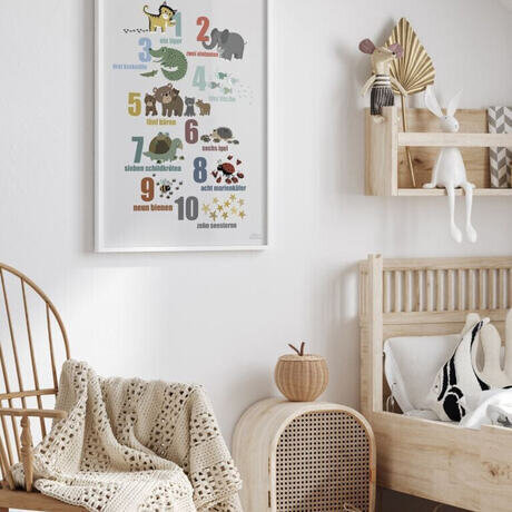 Научитесь считать в увлекательной игровой форме с помощью этого милого плаката! От тигра до десяти морских звезд — каждое число имеет свое животное, что делает обучение визуально увлекательным и увлекательным. Идеально подходит для детской комнаты, чтобы малыши могли одновременно открывать для себя цифры и животных!