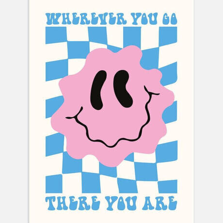 Иногда улыбка стоит тысячи слов! Забавный плакат в чудесно красочных пастельных тонах с вдумчивой поговоркой: «Куда бы ты ни пошел – ты там». Новая интерпретация классического смайлика.