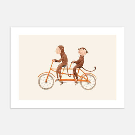 Осторожность! Две счастливые обезьянки приезжают на велосипеде-тандеме! Это будет очаровательный и веселый постер для детской комнаты. Может быть, у вас дома двойня? Или двое братьев и сестер живут в одной комнате? Тогда мы думаем, что этот принт подойдет вам еще лучше! Плакат Monkey Ride имеет встроенную белую рамку, которая элегантно обрамляет мотив.