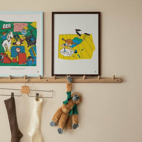 Пеппи Длинныйчулок — вечный персонаж, созданный шведской писательницей Астрид Линдгрен. Обладая добротой, оранжевыми косами, веснушчатым лицом и недюжинной силой, Пеппи ведет полную приключений жизнь на вилле Кунтербунт в сопровождении своего коня Маленького дяди и обезьяны мистера Нильссона. С 1945 года Пеппи покорила сердца читателей всего мира и стала любимым символом свободы, силы и необычности. Изображения проиллюстрированы Ингрид Ванг Найман. Иллюстрация Пеппи Длинныйчулок, пишущей на шведском языке, лежа на полу. Мотив расположен на бежевом фоне.