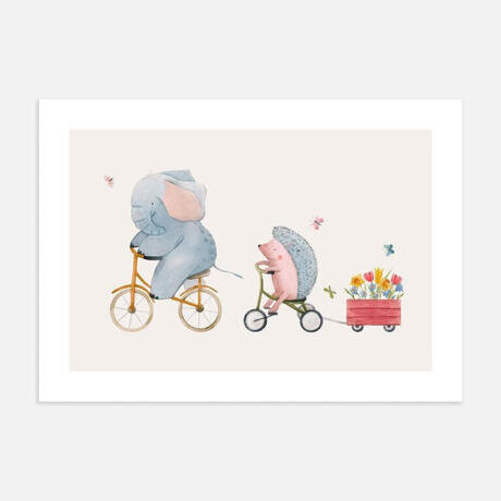 Нарисованная от руки иллюстрация, изображающая двух друзей-животных. Они с удовольствием катаются на велосипеде. Симпатичный мотив на бежевом фоне идеально подойдет для любой детской комнаты. Плакат «Друзья-велосипедисты» имеет встроенную рамку, которая элегантно обрамляет мотив.
