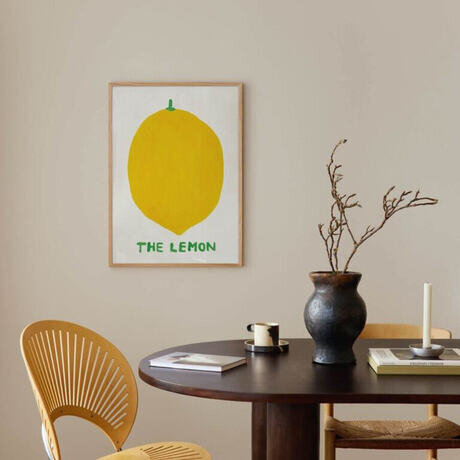 Раскрашенный вручную мотив с изображением желтого лимона на бежевом фоне. Имя написано ниже зеленым цветом. Мотив является частью коллекции «Ателье № 03», созданной нашими штатными дизайнерами для Postery Atelier.
