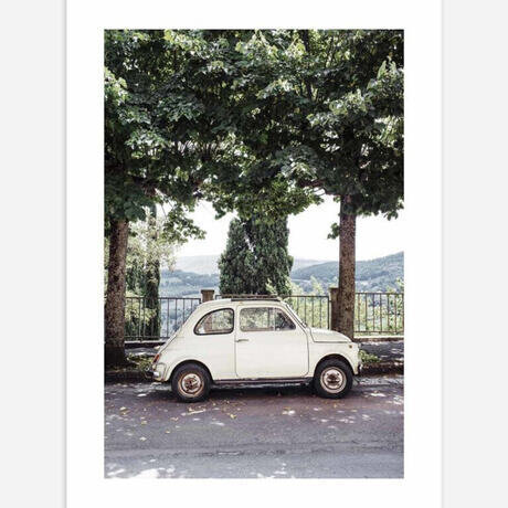 Откройте для себя эту красивую фотографию старого старинного автомобиля, припаркованного под пышными, залитыми солнцем деревьями. Плакат с винтажным автомобилем имеет интегрированное паспарту, которое элегантно завершает мотив.