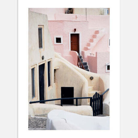 Трудно поверить, что это прекрасное место вообще существует. Розовые дома в Ия на Санторини, красивые формы и привлекательные цвета, действительно являются чем-то особенным. Идеальный плакат для современного дома. Интегрированное паспарту элегантно завершает мотив.