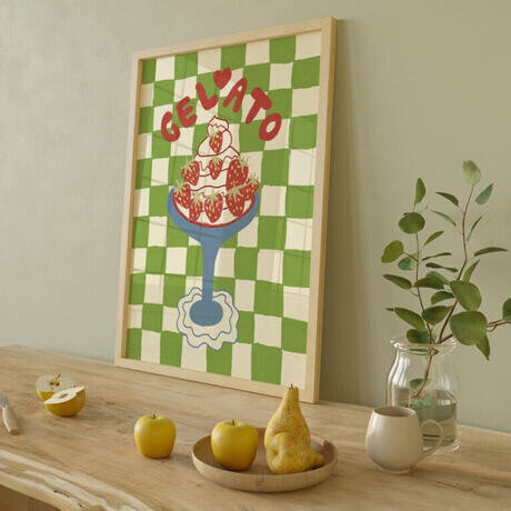Принесите сладость и летнюю атмосферу на свою кухню с помощью этого красочного постера с мороженым. Свежая клубника и манящий десерт из мороженого навевают воспоминания о солнечных днях и итальянском мороженом - идеальном, чтобы добавить нотку радости и игривости в ваше пространство.