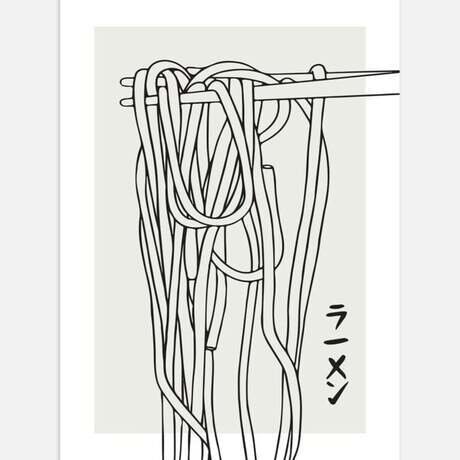 Графическое изображение лапши рамэн черного цвета на светло-сером фоне. В правом нижнем углу слово «рамэн» написано японскими символами. Юмористический, но стильный постер для вашей кухни или гостиной? Плакат Рамэн имеет встроенную белую рамку, которая элегантно обрамляет мотив.