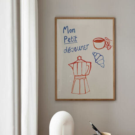 Раскрашенный вручную мотив в синих и красных тонах с изображением кофейника для эспрессо, круассана и кофейной чашки. Французский текст означает «Mon Petit Dejeuner», что означает «Мой завтрак». Мотив является частью коллекции «Ателье № 02», созданной нашими штатными дизайнерами для Postery Atelier.