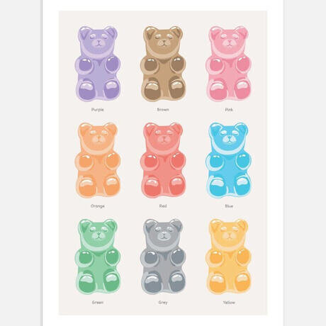 Изучать цвета — это весело (и не только) для сладкоежек! На этом плакате изображены мармеладные мишки, и он обязательно привлечет внимание ваших детей. Все цвета указаны в тексте ниже. Плакат Gummy Bear Colors имеет встроенную рамку, которая элегантно обрамляет мотив.