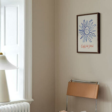 Раскрашенный вручную мотив в стиле кафе с классическим символом Солнца Аполлона синего и красного цветов в качестве визуального центра. Французский текст переводится как «Кафе Солнца». Мотив является частью коллекции «Ателье № 02», созданной нашими штатными дизайнерами для Postery Atelier.