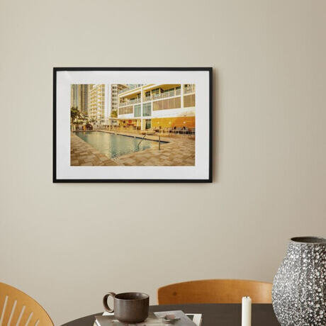 Ретро-фотоарт 1970-х годов с бассейном отеля и небоскребами на заднем плане. Модный постер, яркие желтые цвета которого принесут жизнь и тепло в ваш дом. Попробуйте включить цвета в свой декор; это красиво и создает освежающий контраст с современным интерьером. Винтажный плакат с бассейном имеет встроенную белую рамку, которая элегантно обрамляет мотив.