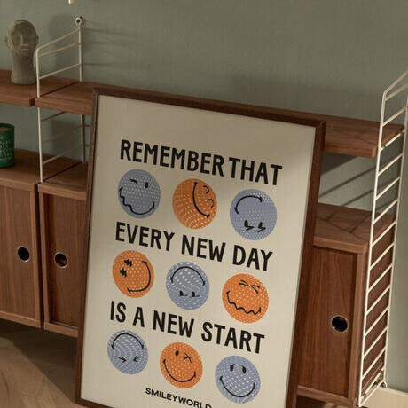 SmileyWorld® x Плакат. Символы SmileyWorld® красного и синего цветов, игриво подмигивающие на кремовом фоне. Текст сообщения призывает по-новому взглянуть на жизнь.