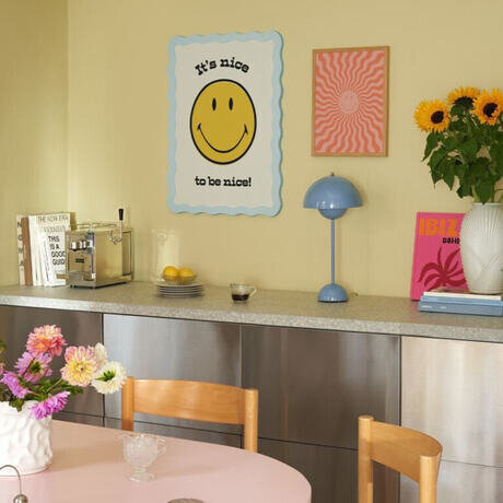 Смайли® х Постер. Отсылка к вечному желтому смайлу Smiley®, сопровождаемому ободряющим текстовым сообщением на белом фоне.
