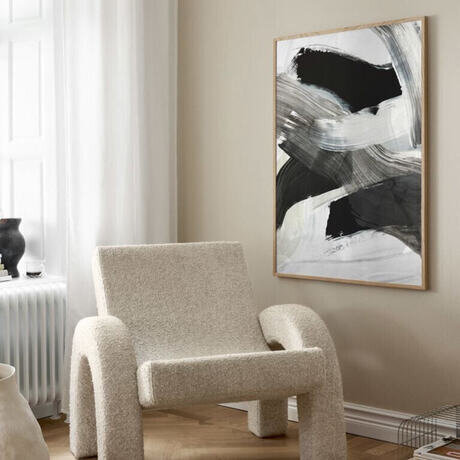 Динамичные черно-серые мазки, контрастирующие с белым, создают ощущение турбулентности и контраста.