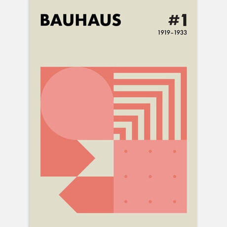 Красная графическая иллюстрация, вдохновленная художественным движением Баухаус, характеризующаяся бескомпромиссными, строгими и геометрическими формами.