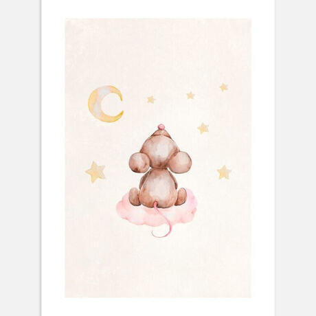 Милый иллюстрированный детский принт, на котором мышонок сидит на облаке и считает звезды. Мотив написан акварелью и имеет красивую текстуру на заднем плане. Плакат Counting Stars имеет встроенную белую рамку, которая элегантно обрамляет мотив.