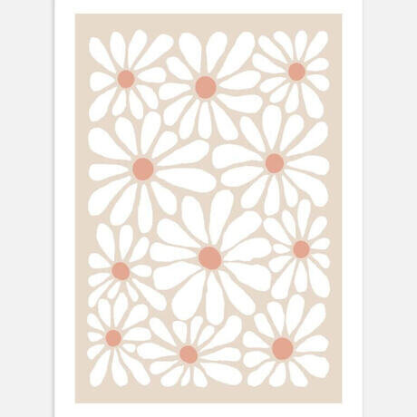 Узор из белых цветов на бежевом фоне. Плакат «Бежевое цветочное поле» имеет встроенную белую рамку, которая элегантно обрамляет мотив.