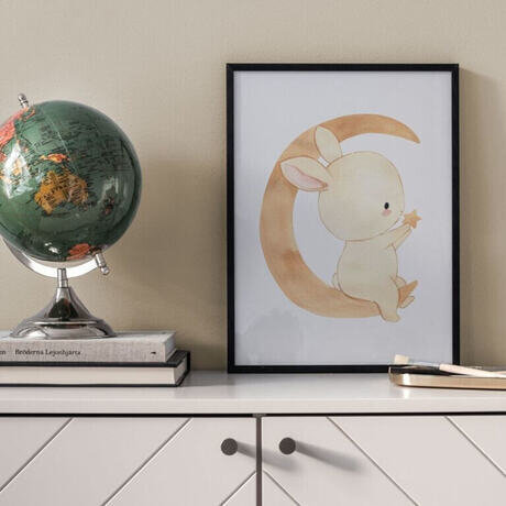 Акварельный плакат с изображением кролика, сидящего на луне со звездой в руке.