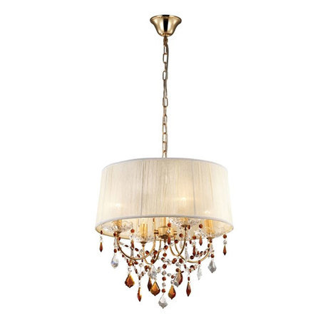 Светильник подвесной с абажуром из плиссированной ткани и каскадом подвесок из огранённого хрусталя, золотой цвет металла эффектно гармонирует с хрустальными элементами насыщенного янтарного цвета